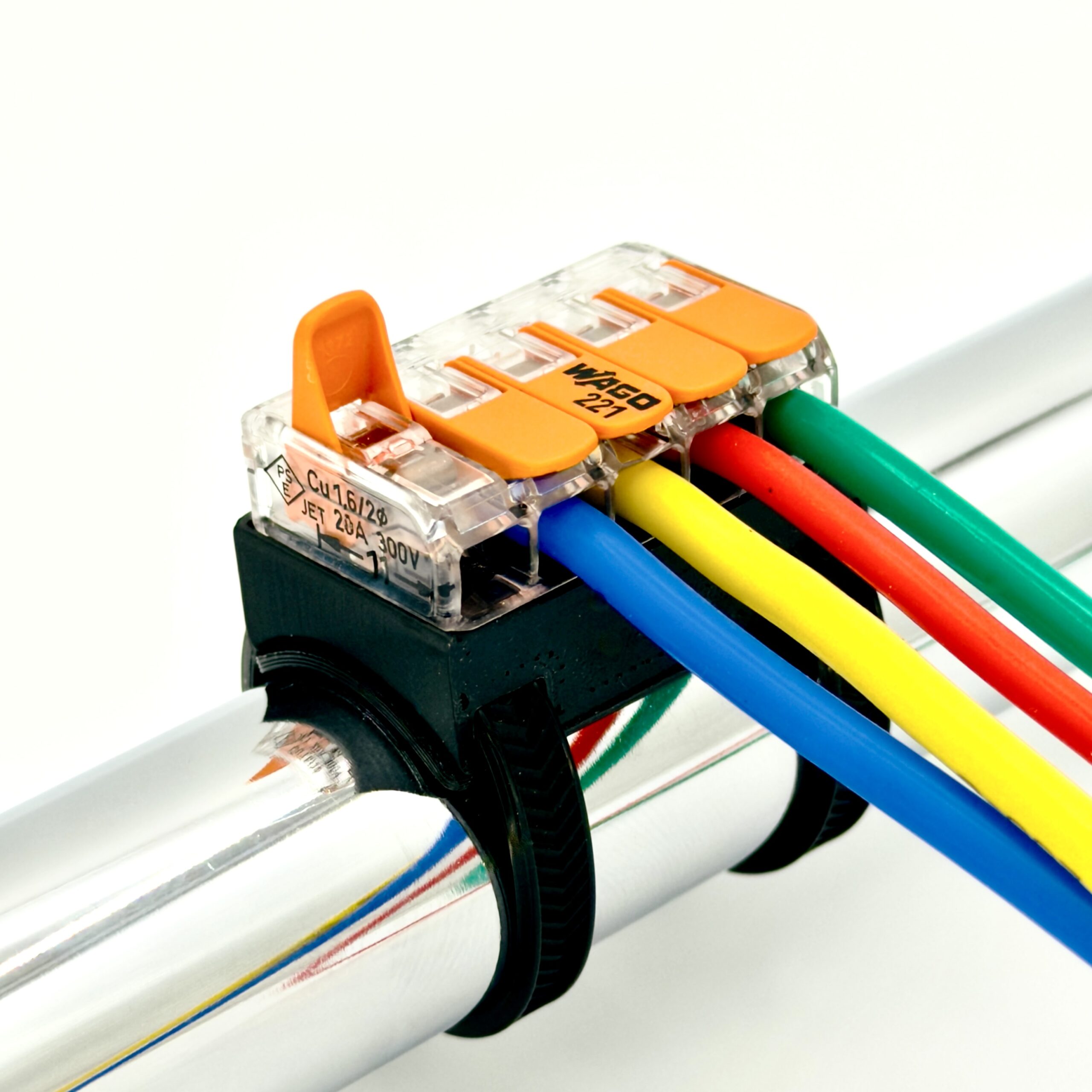 Clean up your wiring with our frame-mount lever nuts! These add an easy, solderless option to splitting connections in your wiring. Simply slide the provided heavy-duty zip ties through the housing, attach them to the frame of your motorcycle. One 5-pin WAGO connectors allow you to easily create small power-buses for ground or power wires.